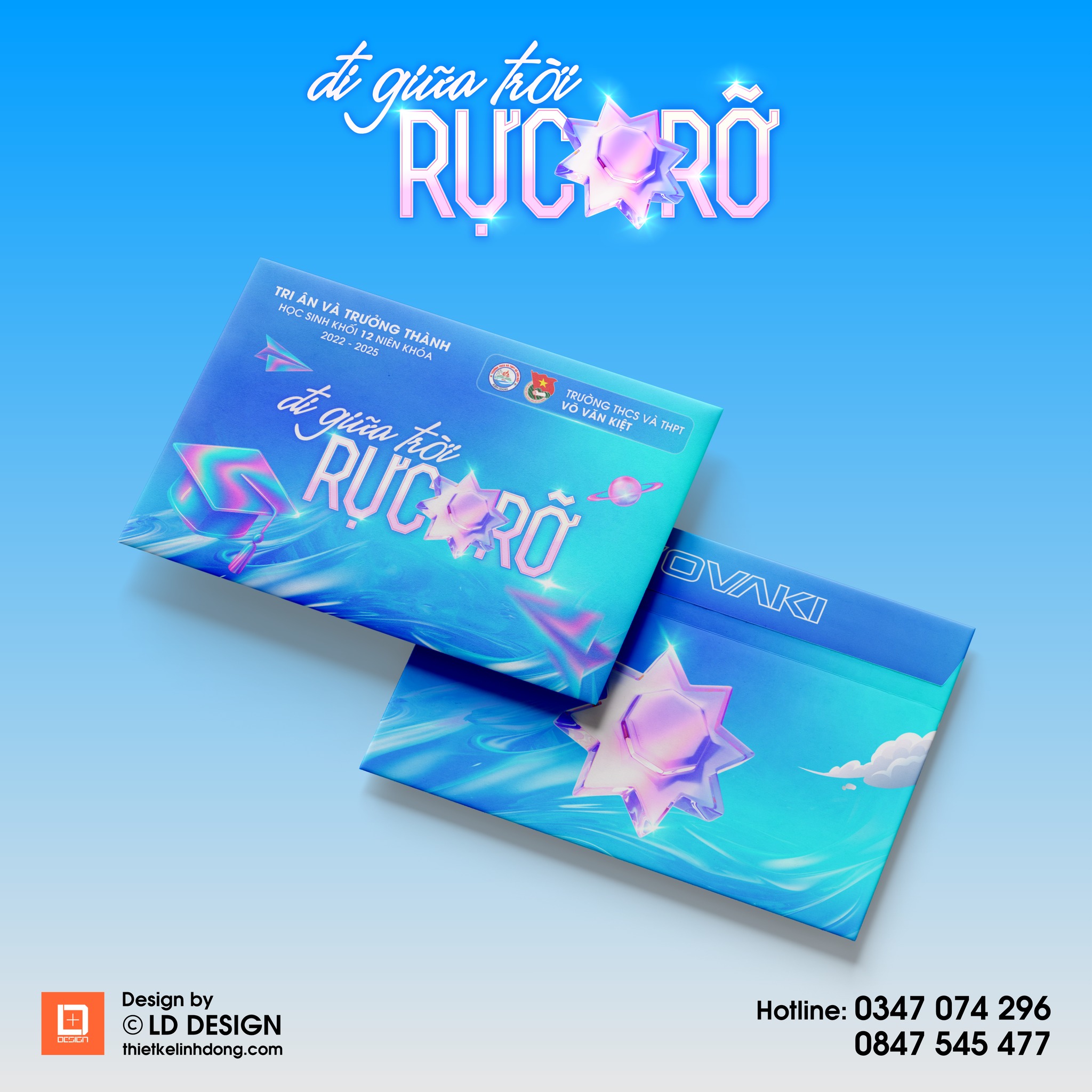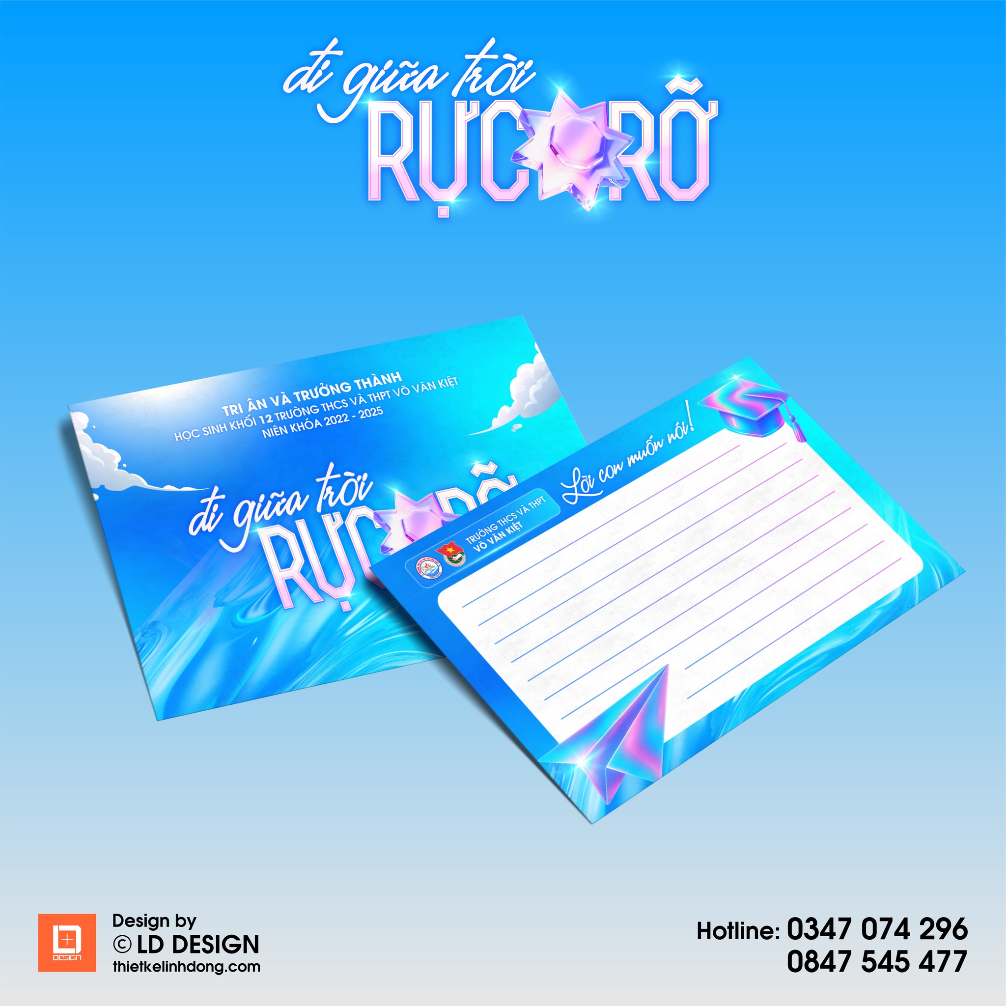 Bộ nhận diện cho chương trình Tri ân và Trưởng thành được thiết kế với phong cách trẻ trung, hiện đại, sử dụng sắc xanh làm chủ đạo để truyền tải sự tươi mới, niềm hy vọng và hành trình trưởng thành của học sinh cuối cấp. Các hạng mục như background màn hình LED, bao thư và giấy viết thư đều được chăm chút kỹ lưỡng về bố cục và hình ảnh, tạo sự đồng bộ và nổi bật. Thiết kế không chỉ mang giá trị thẩm mỹ mà còn kết nối cảm xúc, khơi gợi sự trân quý và lời tri ân sâu sắc.